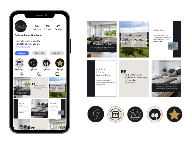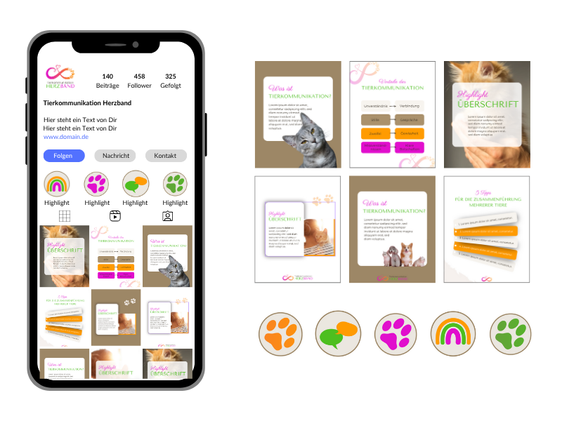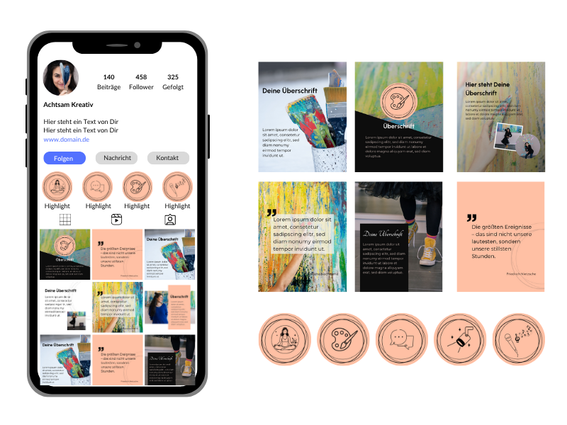 - Professionelles ErscheinungsbildDurch einheitliche Designs für Stories, Beiträge, Highlights und Reels erhält Dein Instagram-Auftritt ein professionelles und konsistentes Erscheinungsbild, das Deine Marke optimal repräsentiert.