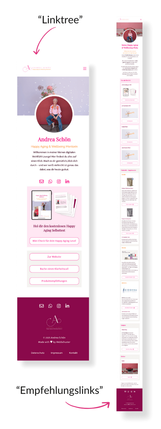 Die Linktrees führen klar und intuitiv zu den wichtigsten Angeboten, Inhalten und Empfehlungen und bieten Besucher:innen eine einfache, strukturierte Orientierung – besonders praktisch für die Nutzung auf dem Smartphone.