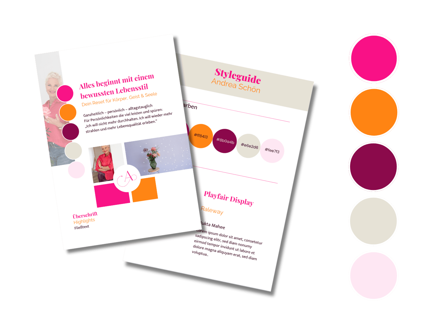 Für Andrea habe ich einen individuellen Farben- und Schriften-Styleguide entwickelt, der ihre Energie, Präsenz und Lebensfreude sichtbar macht. Die kräftige, warme Farbwelt steht für Klarheit, Transformation und neue Lebenskraft und hebt sich bewusst von zurückhaltenden, neutralen Designs ab.